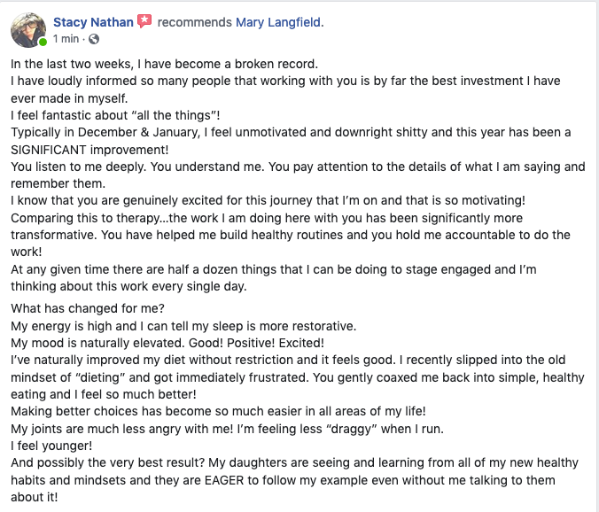 "After working with Mary, I was literally a different person. I had energy again—for life, for work, for me."